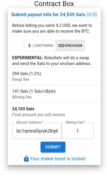 An overview of the fees is displayed and you can enter an on-chain bitcoin address for the payout and also enter the mining fees. The swap fee is an additional fee that RoboSats charges for making the on-chain payment. This does not include the taker/maker fees. The swap fee is charged on the amount after deducting the taker/maker fees.