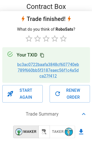 If the on-chain address is valid, then the order moves to the next stage as usual. At the end, if the trade was successful, then you should see a screen something like this with the transaction ID of the payout: